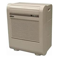 Portable 7000-BTU air conditioner for rooms up to 160 square feet Electronic controls; remote control; 3 cool settings; 3 fan settings; 8.2 EER Dehumidification function; self-evaporating system; 24-hour on/off timer; air filter Condensation-collection bottle and 5-foot exhaust hose with window kit included Measures 13-1/8 by 18 by 24-3/8 inches; 1-year limited warranty